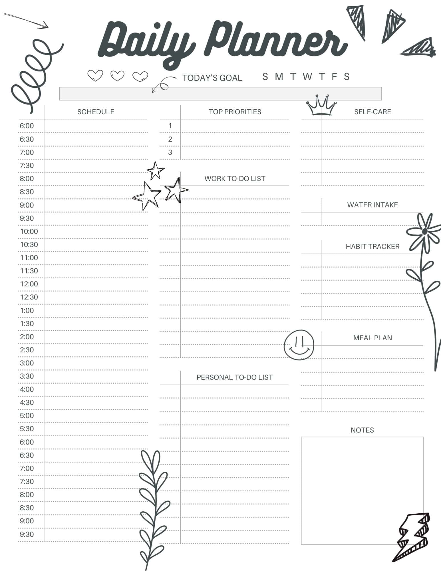 Doodle-style daily planner is super cute and fun. With space for your schedule, priorities, self-care, to-do list, water intake, habit tracker, meal plan, and notes.