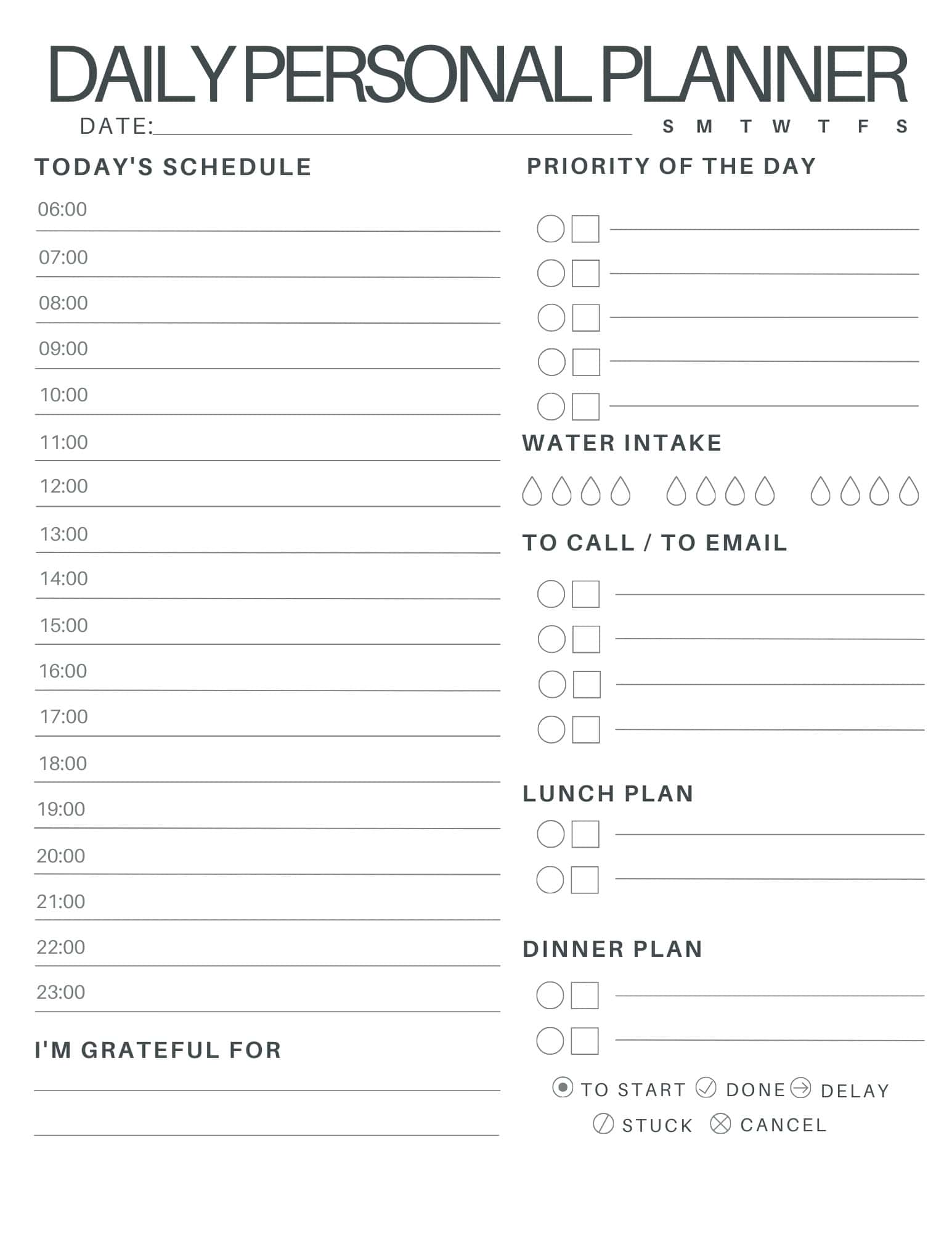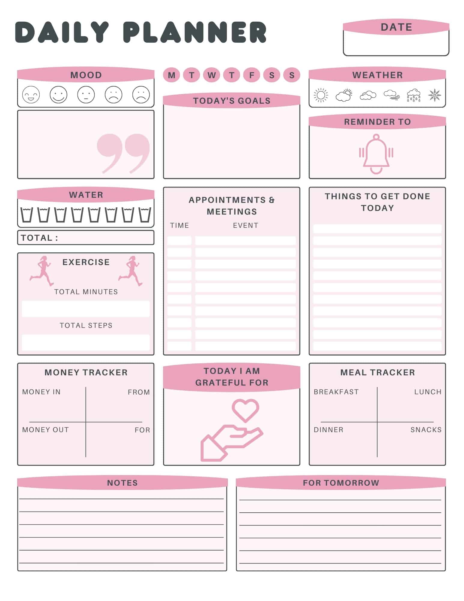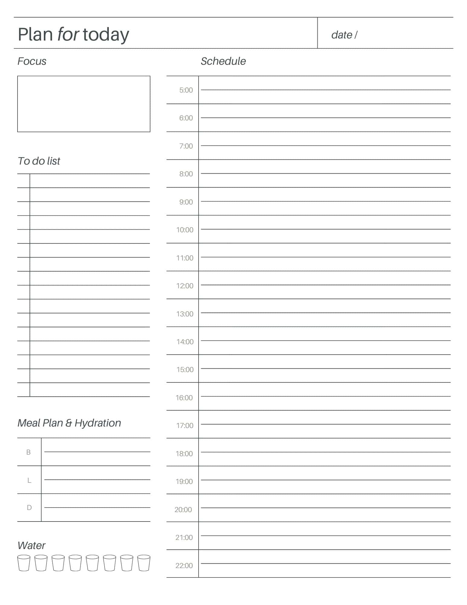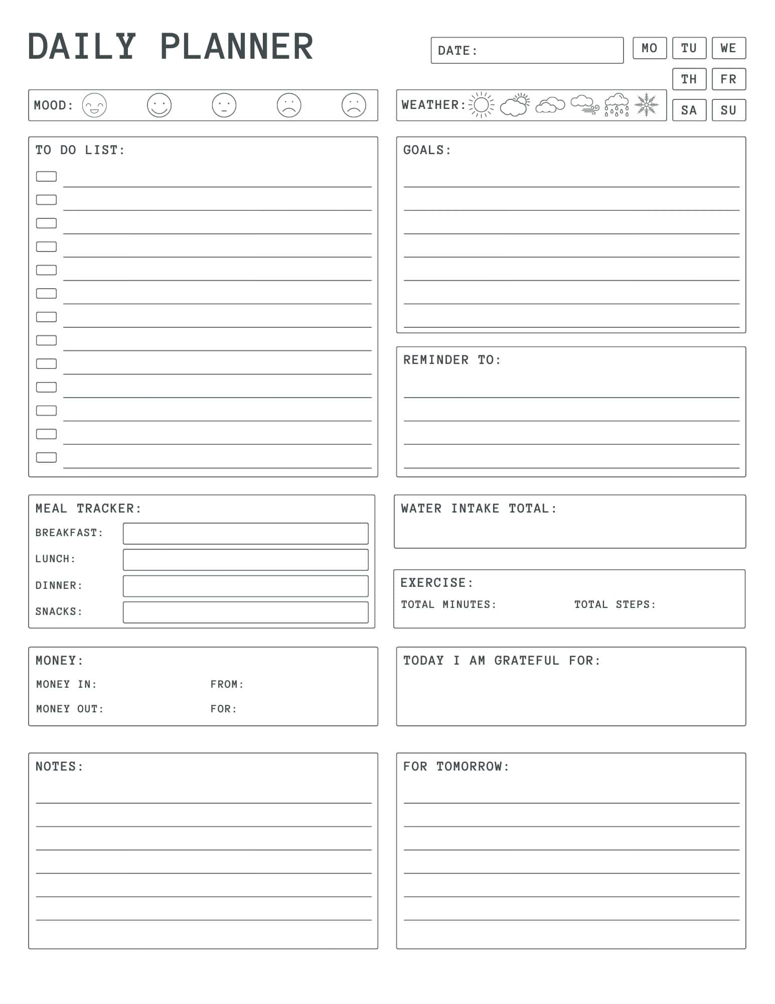Print your favorite daily planner and use it alongside your workout log, meal plan, or water tracker.