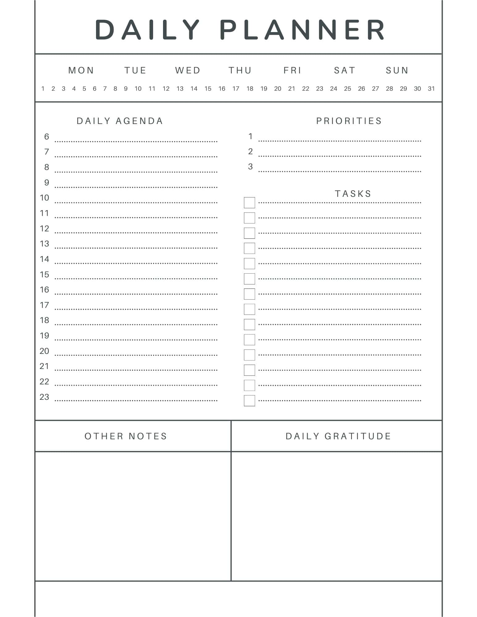 Minimalist daily planner with circle-the-date, daily agenda, priorities, tasks, notes, and gratitude.