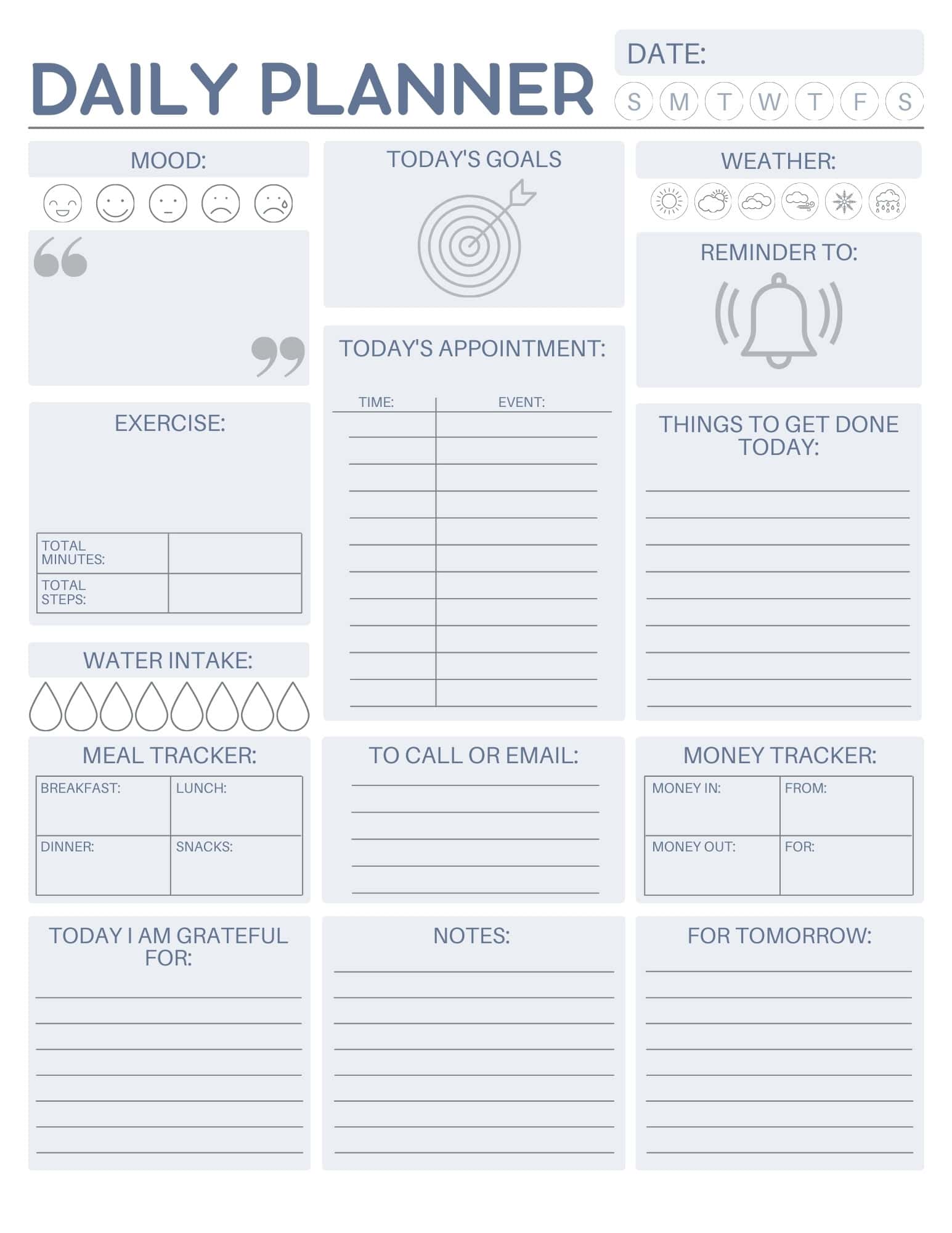Daily planner with cross-off date, emoji mood tracker, weather icons, daily goals, quote of the day, reminders, appointments and meetings, to-do list, exercise tracker, water intake, money tracker, email and call list, meal tracker, gratitute, coming up for tomorrow and misc. notes.