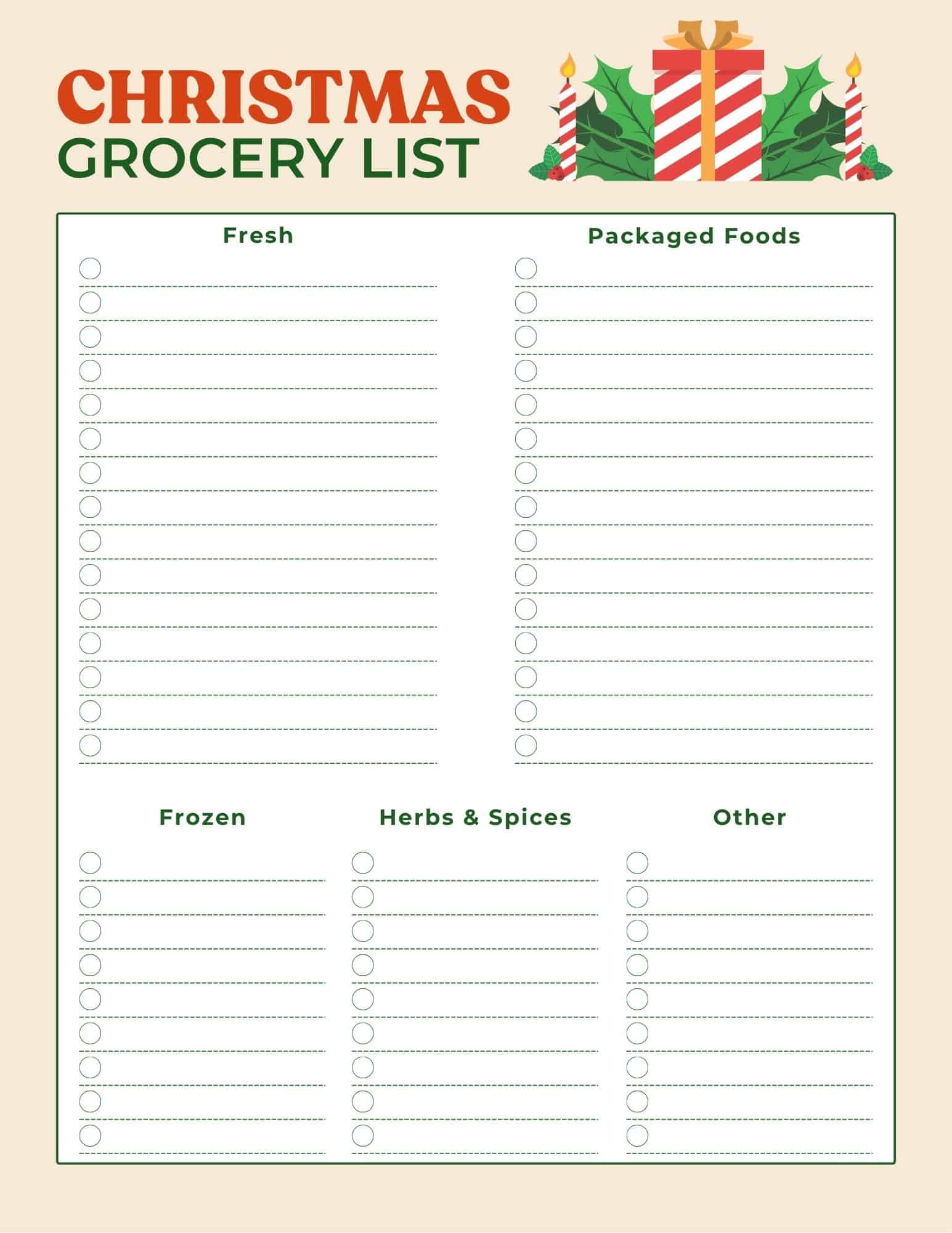- Christmas dinner grocery list with fresh + packaged foods, frozen, herbs and spices sections
