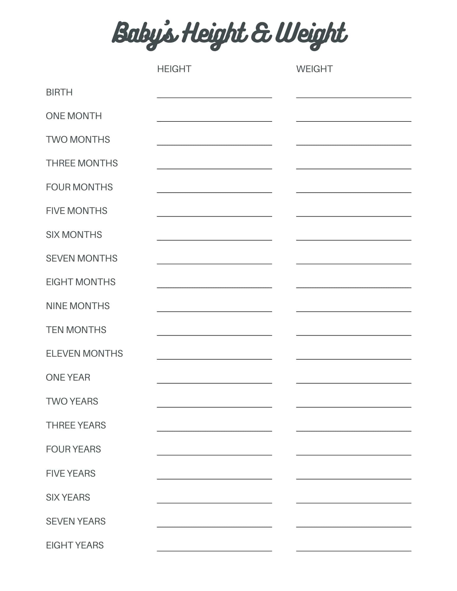 This retro-style baby journal height and weight chart follows your child monthly from birth until age one, and then to age eight.
