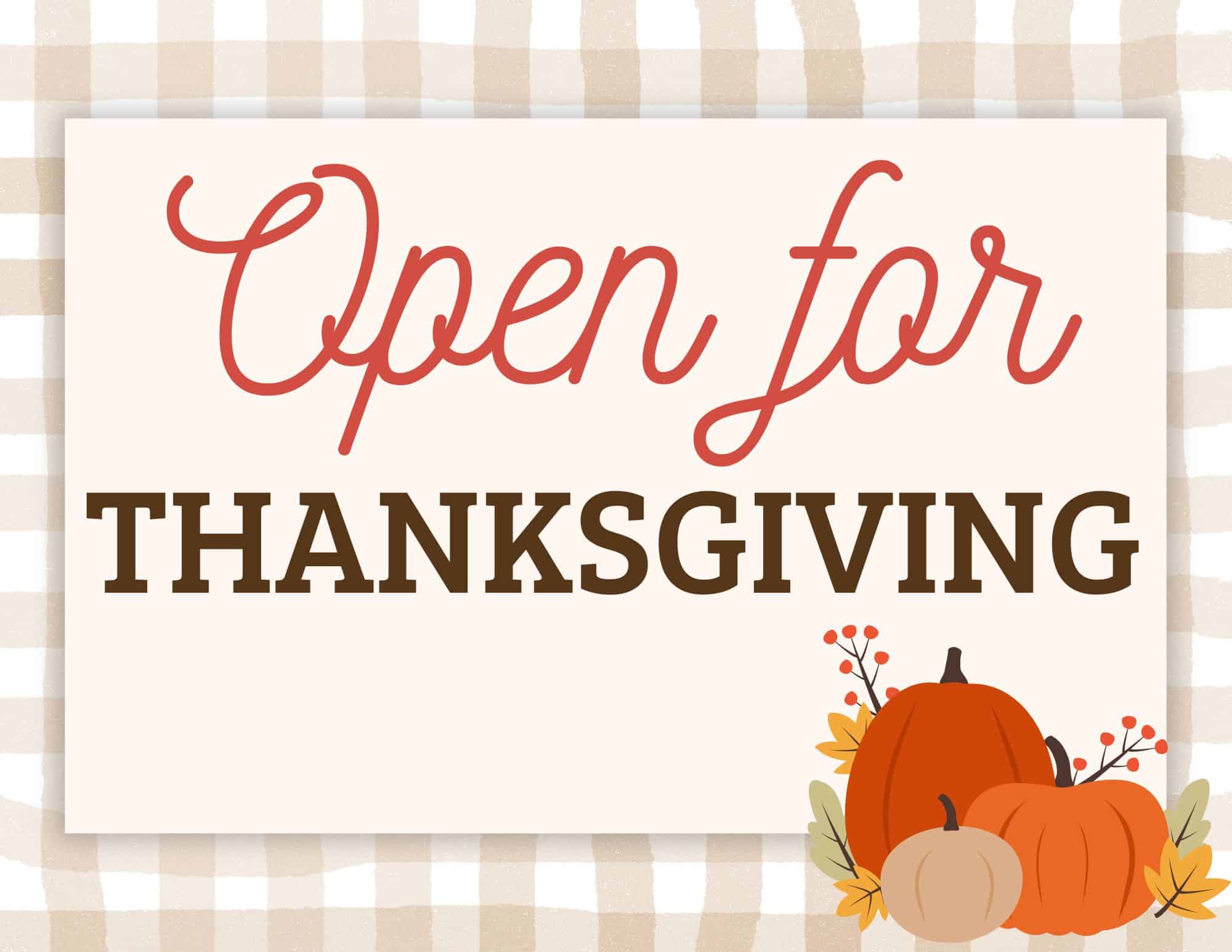 This free open for Thanksgiving sign makes it easy to communicate your hours. Quick to print and simple to use.