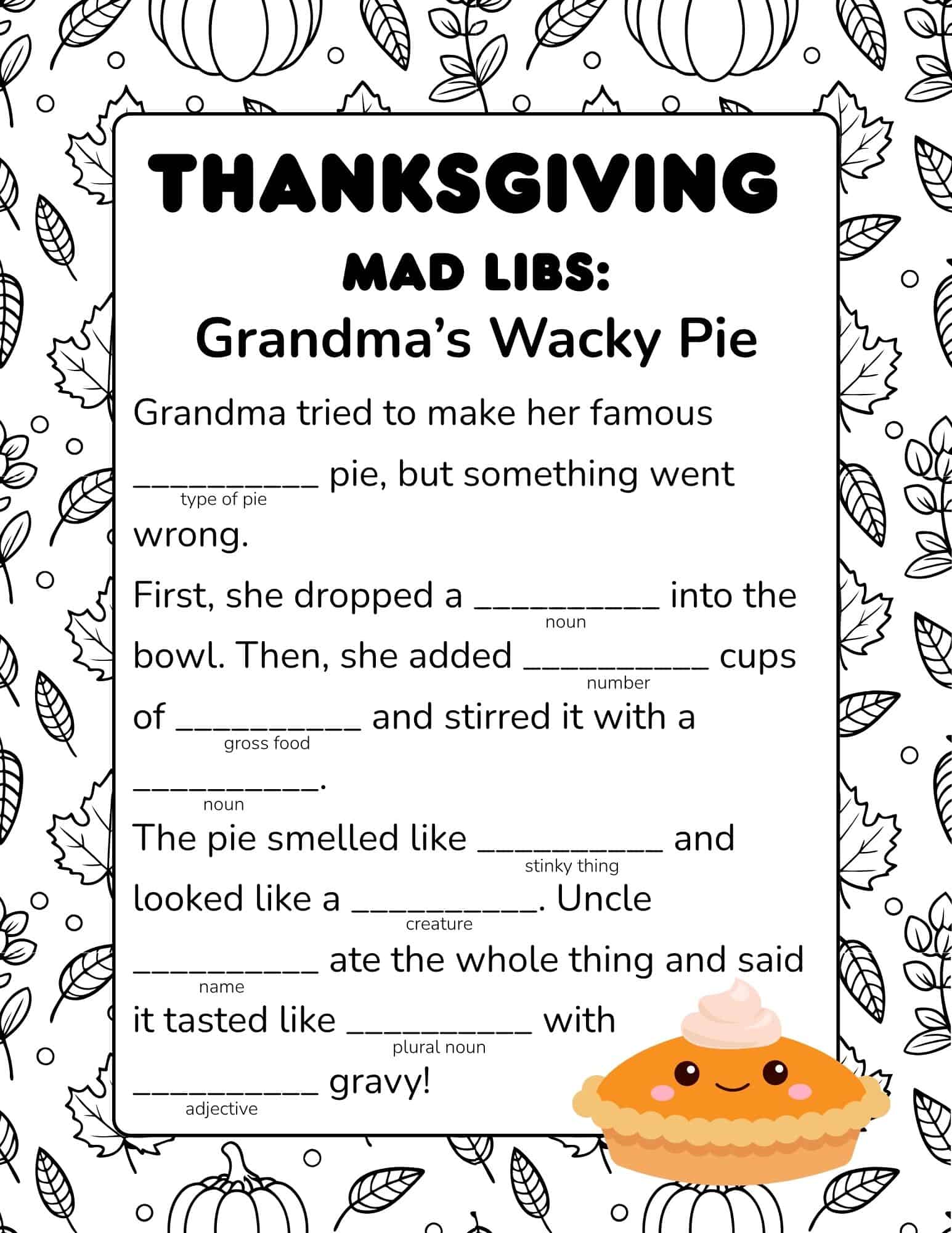 Silly Thanksgiving Mad Libs worksheet for Elementary and Middle school students. Grandma’s Wacky Pie.