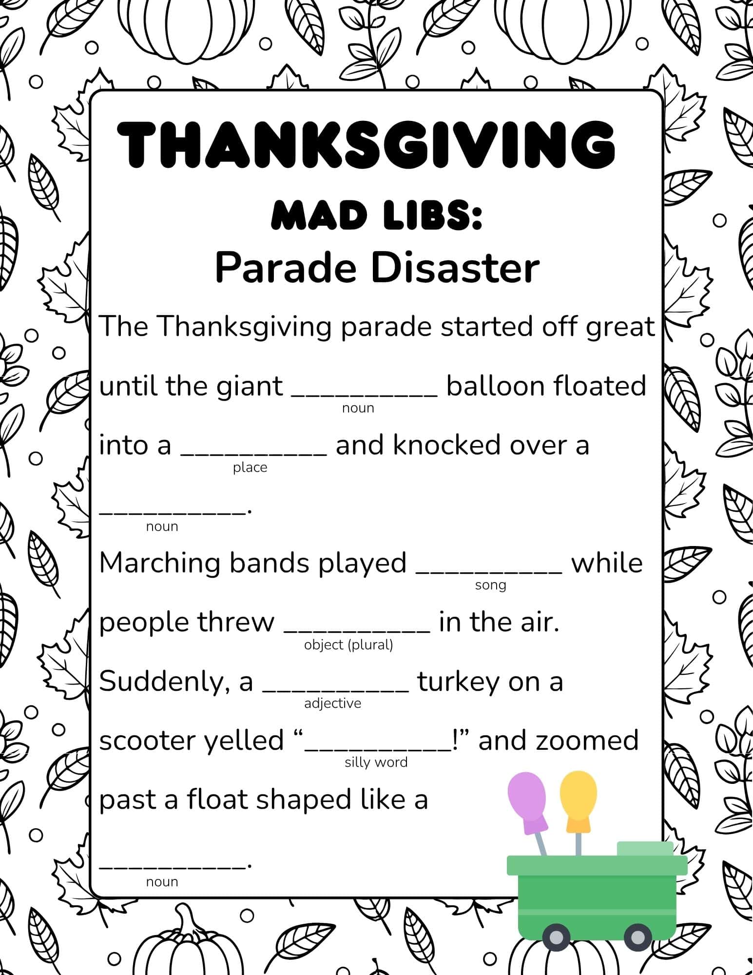 Parade Disaster funny Thanksgiving Mad Libs for elementary and middle school students. Free printable PDF.