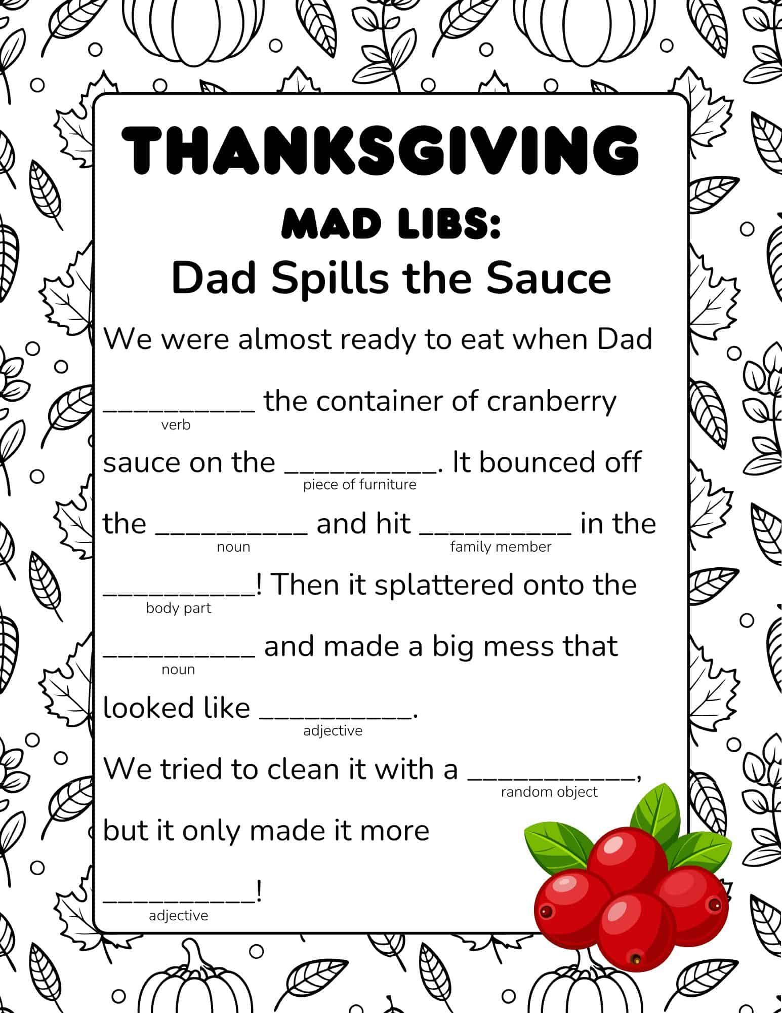 Free Thanksgiving Mad Libs PDF, “Dad Spills the Sauce,” silly worksheets for kids.