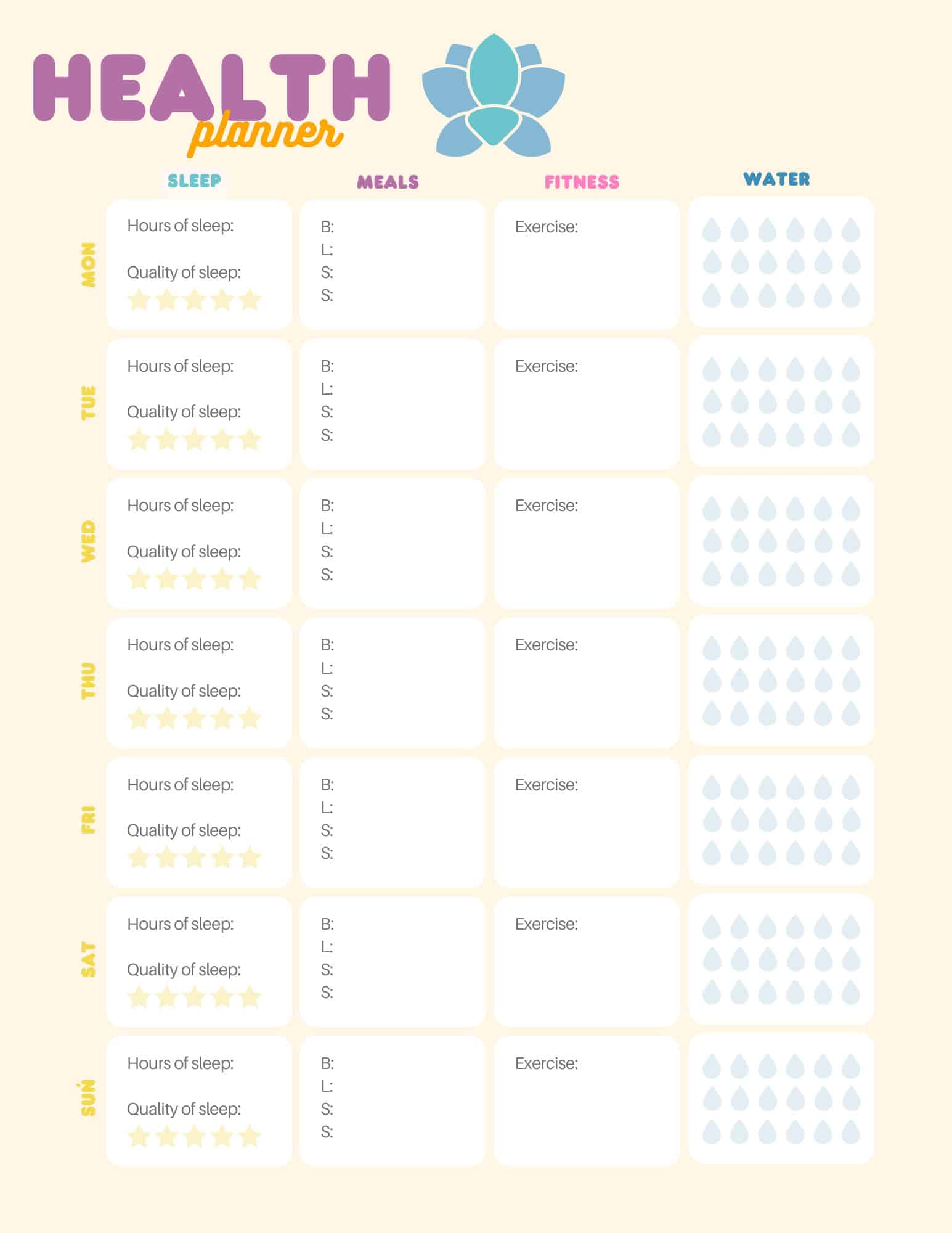 A weekly wellness and health planner to track your sleep, meals, fitness and water intake.