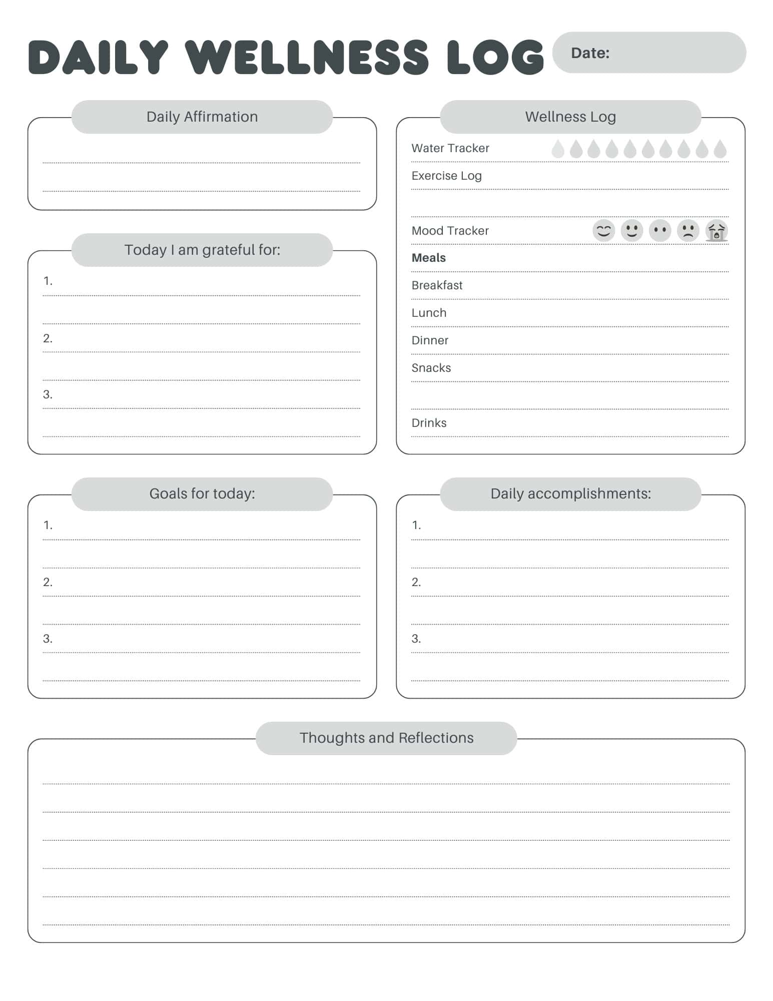 A daily wellness log with an affirmation, water tracker, exercise log, mood tracker with emojis, gratitude, goals, accomplishments, and space for reflection.