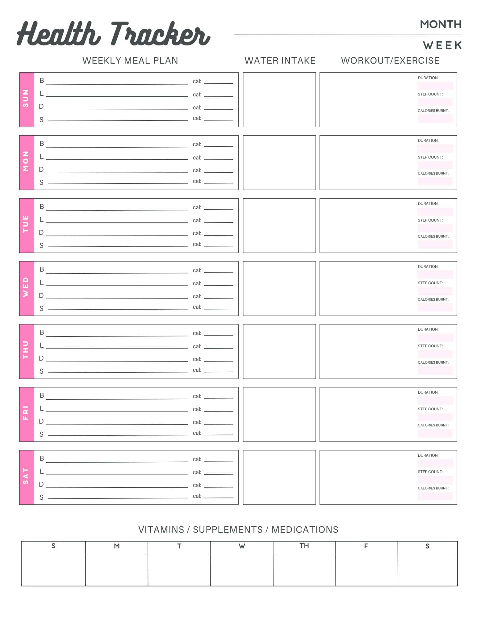 A weekly health tracker for your meals, water intake, calories consumed, and workout and exercise.